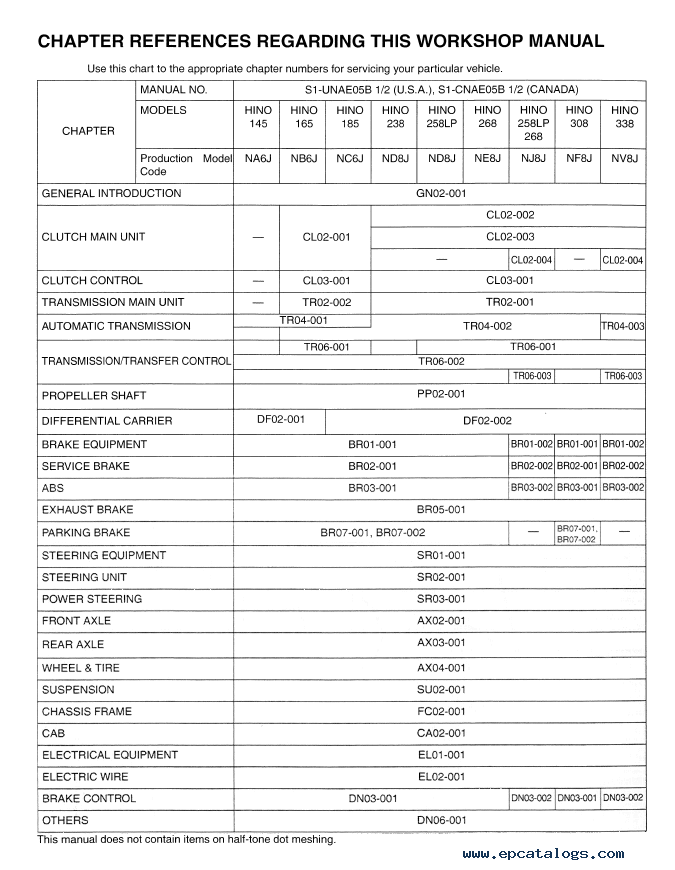 This factory set of manuals was prepared by Hino specialists and consist of two files manuals No. UNAE05B and CNAE05B. These manuals provide the owner and the service technician with the most necessary and proper information for repair that may be required by the trucks 2009 year of the following series of 145, 165, 185, 238, 258 LP, 268, 338 with the engine: