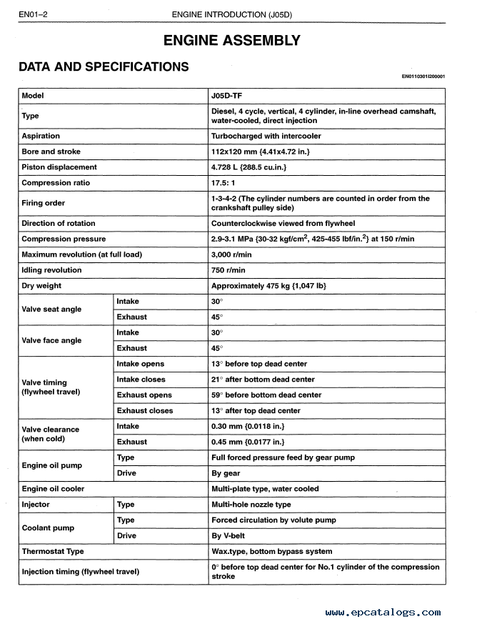 Hino Trucks J05D-TF Engine 2009 Workshop Manual PDF