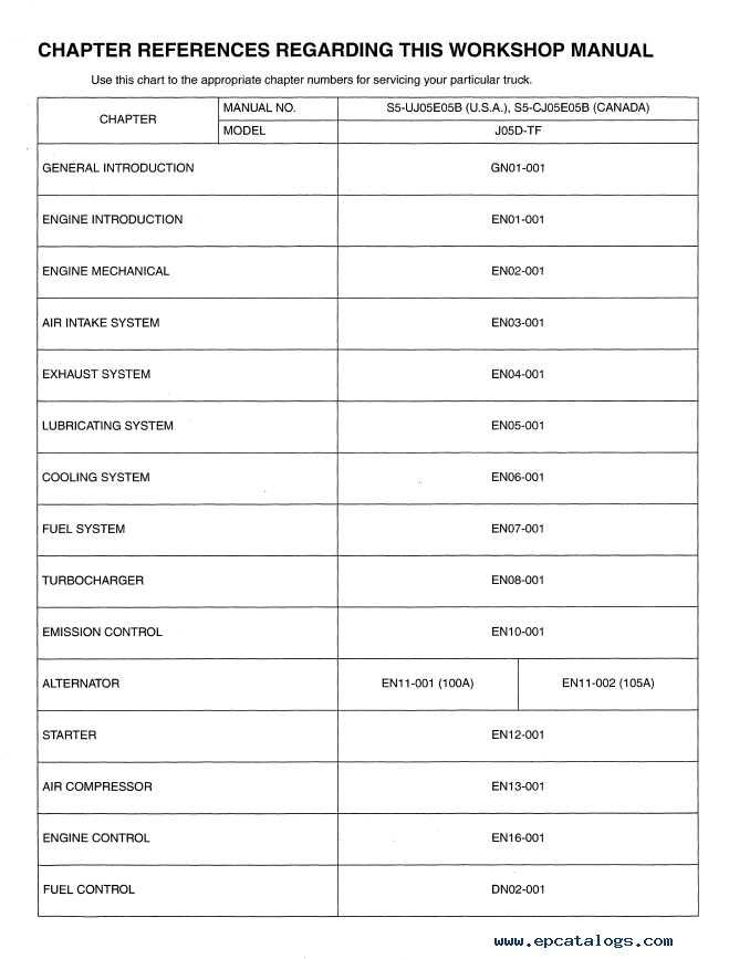 [2009]On our site, we present instructions - the Hino workshop manuals NO. S5-UJ05E05B, S5-CJ05E05B for the Hino trucks 2009 with J05D-TF engine.