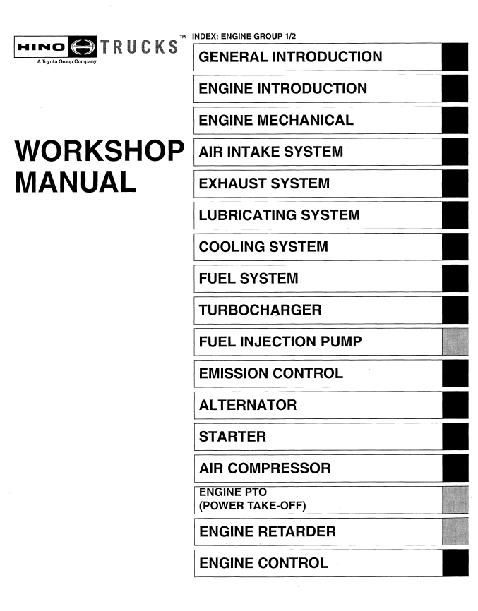 Hino workshop manual will help you quickly and easily understand all the internal systems of Hino trucks 2009 years and helped for the further correct use.