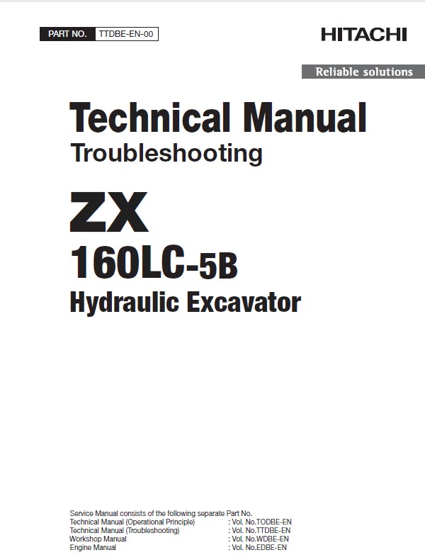 For example, for the current repair and the routine maintenance of the Hitachi Hydraulic Excavator ZX160LC-5B Model, you need to use this PDF Technical Manual (Troubleshooting).
