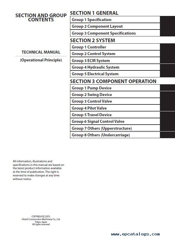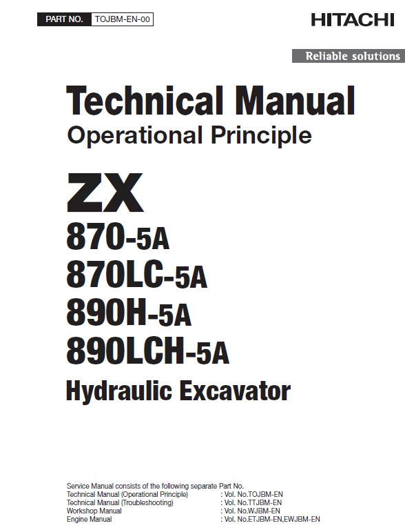 This PDF Technical Manual (Operational Principle) is written for an experienced technician to provide technical information needed to maintain and repair Hitachi Hydraulic Excavators ZX870-5A, ZX870LC-5A, ZX890H-5A, ZX890LCH-5A.