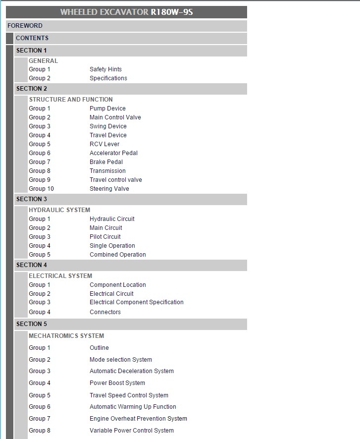 [2014]This PDF Service Manual includes instructions for maintenance, special repair instructions, diagrams and charts, troubleshooting information for wheel excavators Hyundai R180W-9S. This guide contains step-by-step instructions for operation and maintenance, machine data, information on preventive maintenance and troubleshooting.