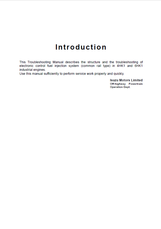 []This Troubleshooting Manual was written for correct use and repair procedures, technical maintenance, and troubleshooting of Isuzu Diesel Engine 4HK1, 6HK1 model.