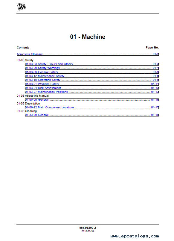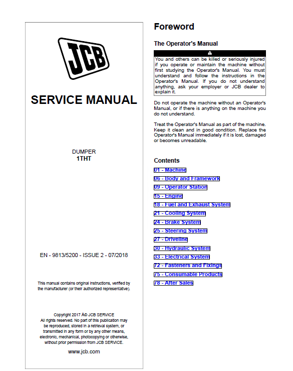 [07/2018]This service manual describes in detail the JCB Dumpster 1THT model, its design, the principle of operation of the nodes, as well as their replacement and maintenance.