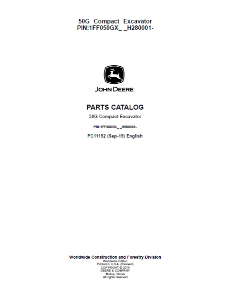 [2019]On this website, you can see the complete Parts Manual with different instructions and many illustrations for John Deere 50G Compact Excavator model. Electronic catalog contains clear information with rules and notes about the product and helps to identify existing and potential problems.