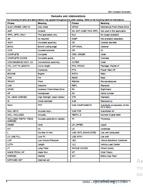 This electronic catalog covers information about safety, the section about spare parts, serial number location, operation material, a list of parts, system section, accessories information, settings, etc.