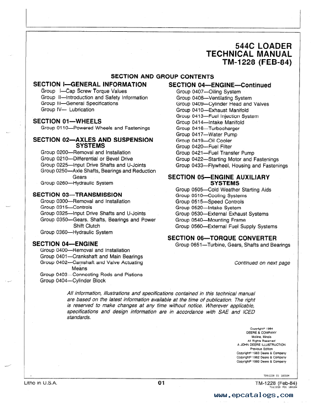 [02/1984]Technical manual contains service and repair information, specific installation instructions, technical specifications, pictures and drawings for John Deere loader 544C.