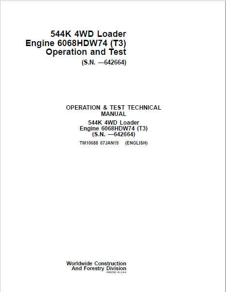 [2019]The Operation and Test Technical Manual - a convenient, fast, and efficient guide for using, maintenance and troubleshooting of John Deere 544K 4WD Loader Engine 6068HDW74 (T3) model. Factory file includes many sections with information about the setting, check and service, transmission, operation, hydraulic system, engine section, the safety rules, technical data, system information, a lot of illustrations and diagrams with descriptions, tables, and schemes.