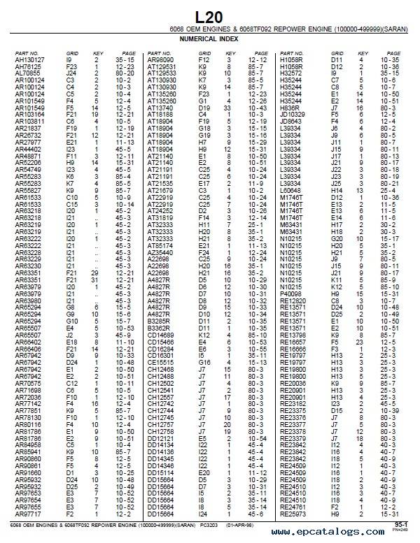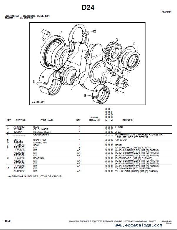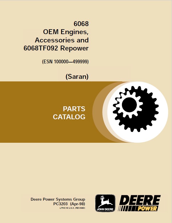 [04/1998]This PDF Parts Catalog has intended for John Deere 6068 OEM Engines, Accessories, and 6068TF092 Repower. It includes detailed tables with parts and accessories, serial number information, lots of illustrations, charts, and pictures.