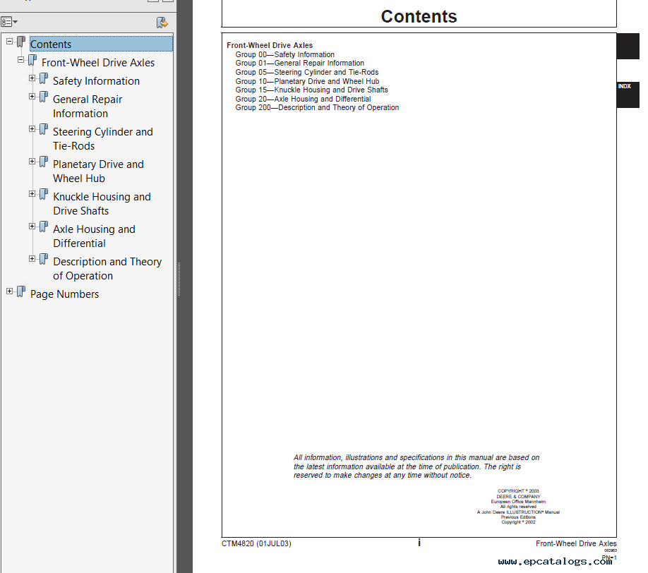 [07/2003]Component technical manual includes safety and general repair information, detailed description and methods of operation and service for John Deere Front-Wheel Drive Axles.