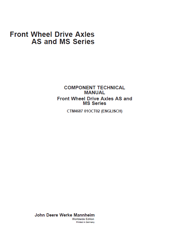 [10/2002]This technical manual includes detailed safety and general repair information, description and method of operation for John Deere Front Wheel Drive Axles AS and MS series.
