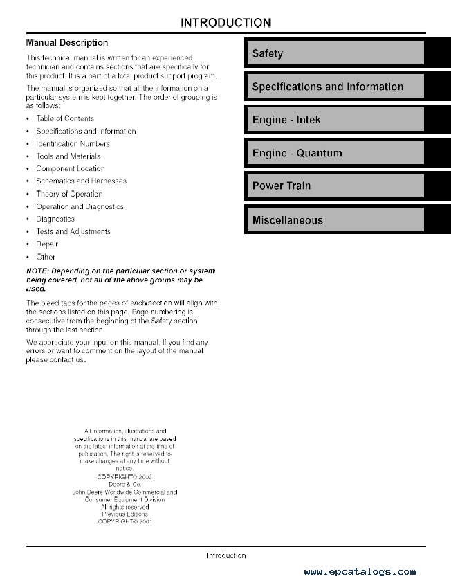 [11/2003]Technical manual contains detailed service information, special instructions for repair and troubleshoot, wiring diagrams, service and other additional information that is presented specifically for walk-behind rotary mowers John Deere JS60, JS60H, JS61, JS63, JS63H, JS63E.