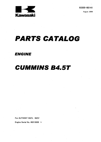 [2006]The Parts Manual contains complete information and instructions with different diagrams and schemes for Kawasaki Cummins B4.5T Engine model. Electronic manual covers sections about a list of parts, technical data, safety rules, settings, troubleshooting, specifications, engine material, many screenshots, different diagrams, tables, and schemes.