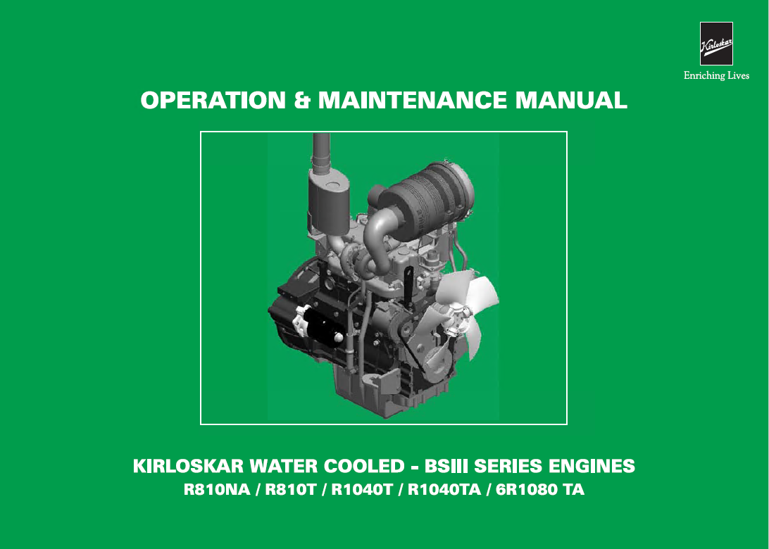 []We are pleased to present to you this version of the Kirloskar Water Cooled Operating and Maintenance Manual - BSIII Series Engines R810 / R1040 / R1080.