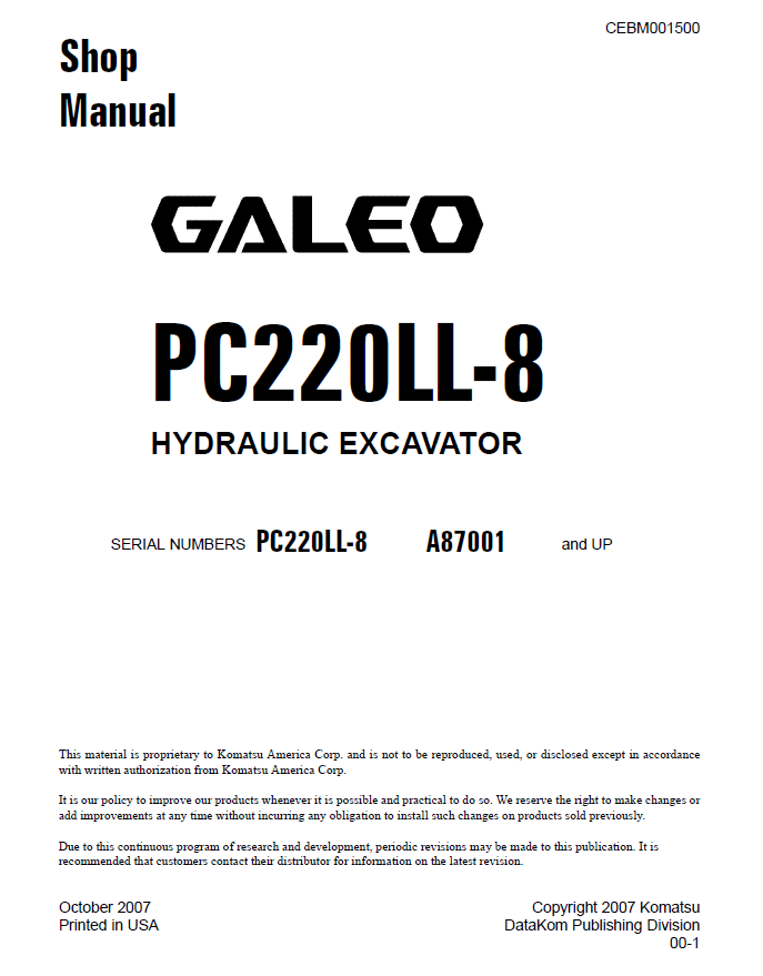 1. Komatsu Hydraulic Excavator Galeo PC200-8, PC200LC-8, PC220-8, PC220LC-8 Operation and Maintenance Manual TEN00147-05