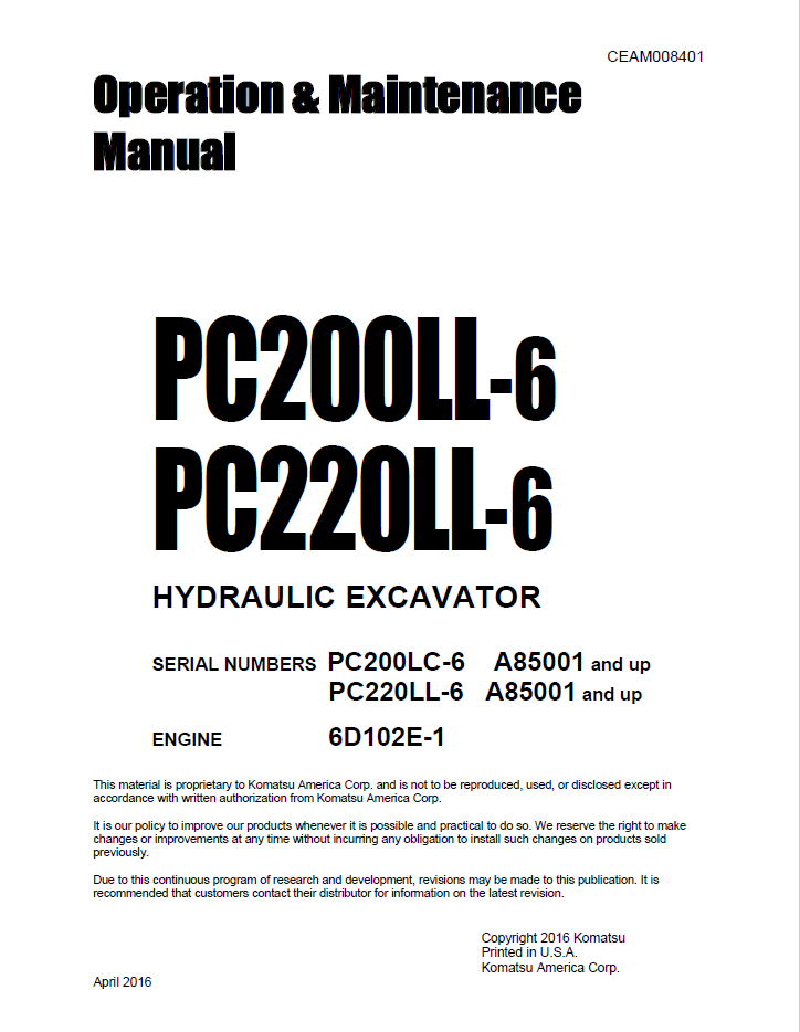 [2016]This Operation and Maintenance Manual has been prepared with the latest information available at the time of publication. Factory guide includes several sections with helpful information about safety rules instructions, operation section, technical maintenance, specifications, setting, step-by-step recommendations about repair, images with descriptions, diagrams, schemes, and additional information for Komatsu PC200LL-6, PC220LL-6 Logging Excavator models.
