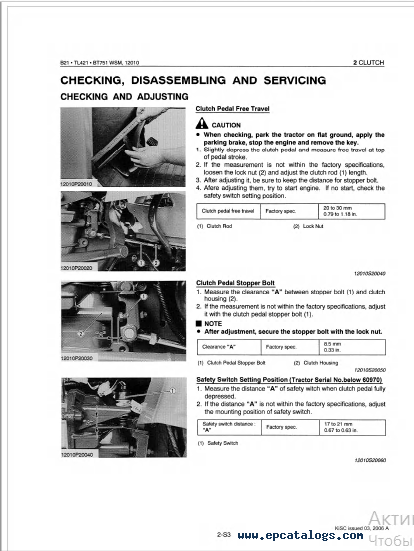 [2006]This Workshop Manual was written for correct use and repair procedures, technical maintenance, and troubleshooting with different important illustrations of Kubota B21, TL421, BT751 Tractor, Front Loader, Backhoe models. Electronic guide contains sections about specifications, system section, engine information, transmission, service instructions, and more.