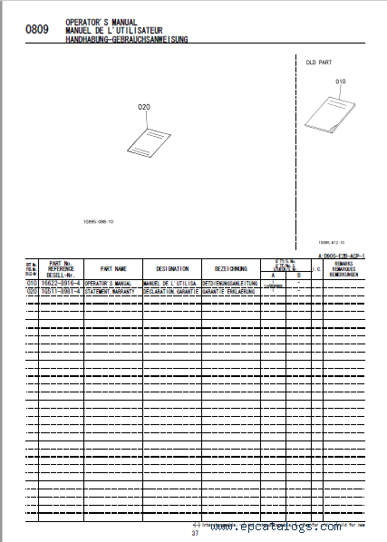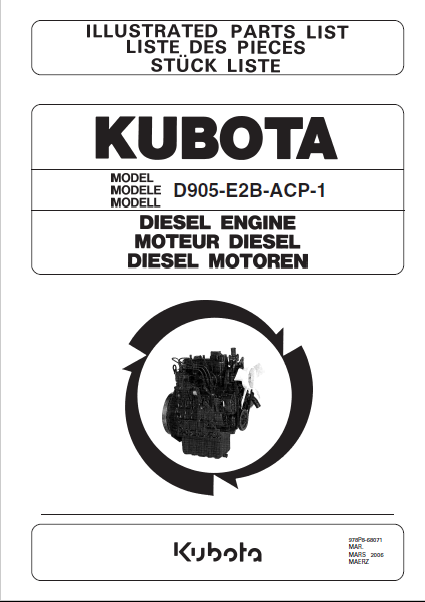 You schould familialize and read this Kubota product specially the rules and notes to avoid any breakdowns, injuries or damage, when you work with this Diesel Engine D905-E2B-ACP-1. Online text comes in PDF format in the English, French, and German languages. To work with the Illustrated Parts List, you need to install the application Adobe PDF Reader. Total: 50 pages.