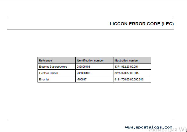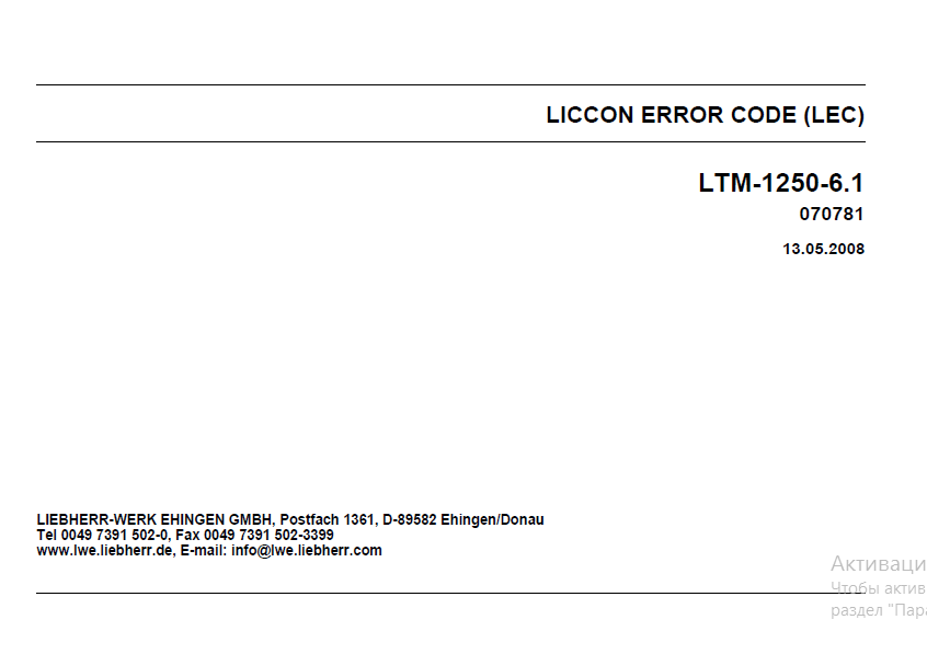 [2008]Please, attention! We want to present this Electronic LIEBHERR Error Code (lLEC) Manual in PDF format especially for LTM 1250-6.1 LICCON. Electronic material - a convenient, fast, and efficient guide with helpful illustrations, different and important schemes and tables.