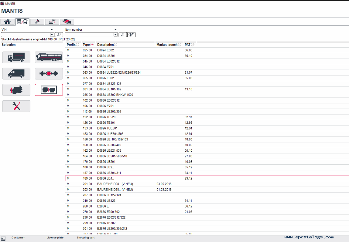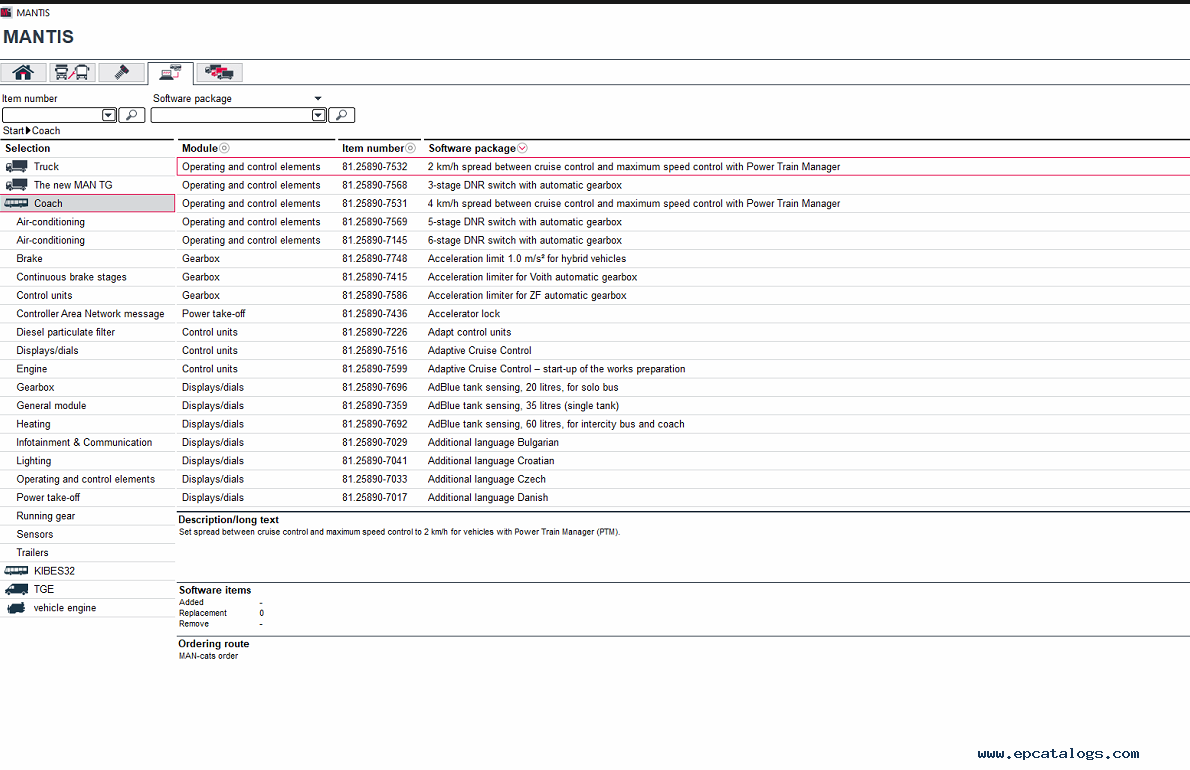 Man Mantis 7.1 is a MAN Truck & Bus AG electronic spare parts catalog. The electronic catalog contains information on spare parts and accessories, a detailed model list for trucks, coaches, engines, industrial-marine engines, and TGE of Man, with the last updates in April 2025.
