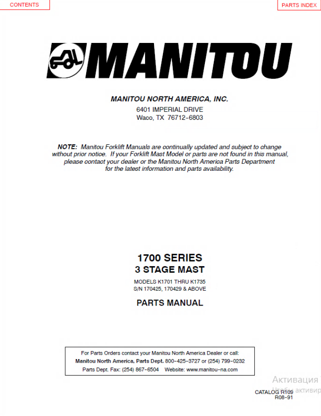 []Parts Manual has been designed to help you identify, locate and order replacement parts for Manitou Forklift 1700 Series 3 STAGE MAST. Electronic tutorial includes step-by-step instructions, descriptions, system section, safety, technical data, troubleshooting, many different tables, images, diagrams, schematics, etc.
