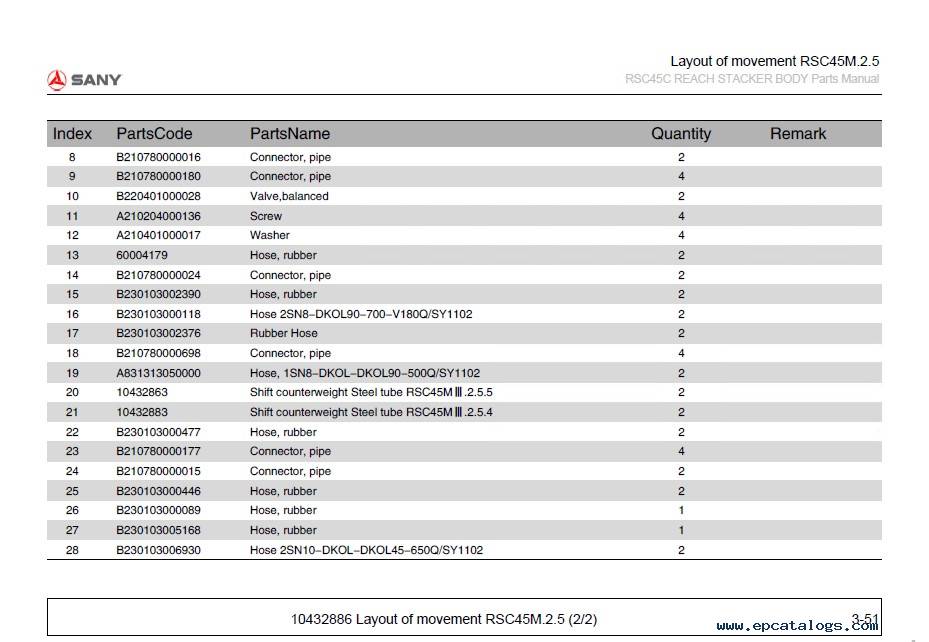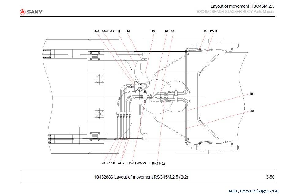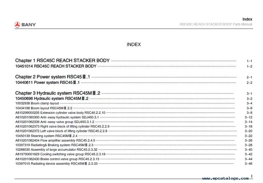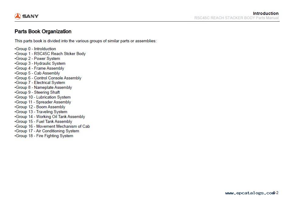 []This PDF Parts Book provides illustrations and parts listings required for you to properly identify and order spare or replacement parts for the Sany Container Reach Stacker RSC45C Model. If this book becomes damaged, lost, or illegible, request a replacement copy from your Sany distributor as soon as possible.