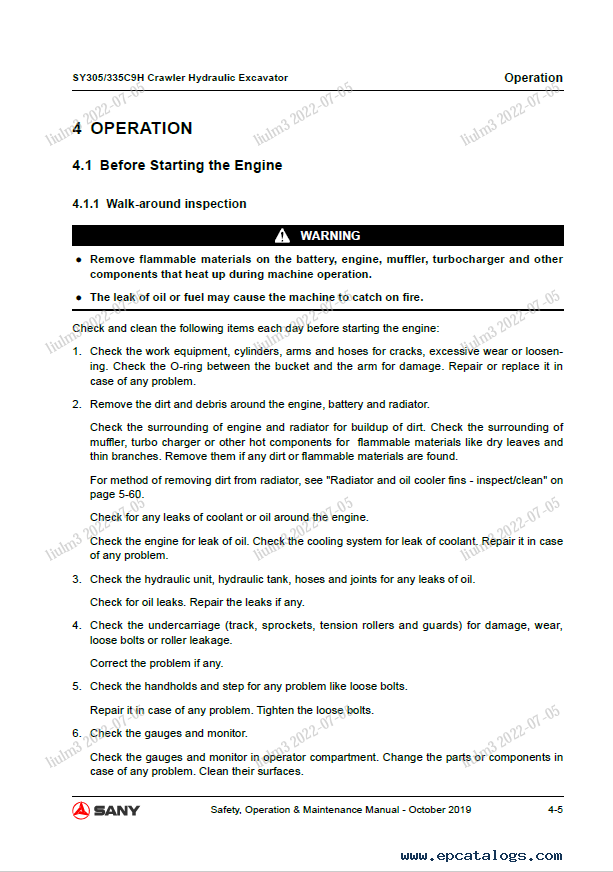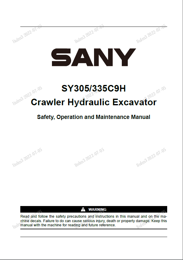 [2019]On this website, we want to present to you the Safety, Operation and Maintenance Manual of Sany Crawler Hydraulic Excavator SY305/335C9H models. This tutorial is divided into sections with general material instructions, safety, technical data, operations, maintenance, service instructions, and more.