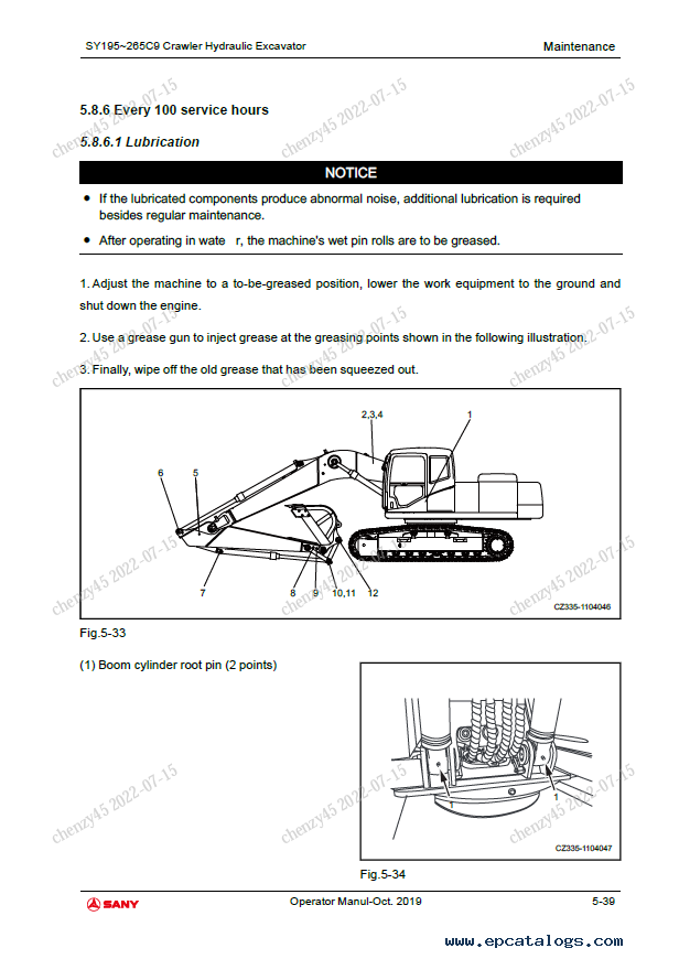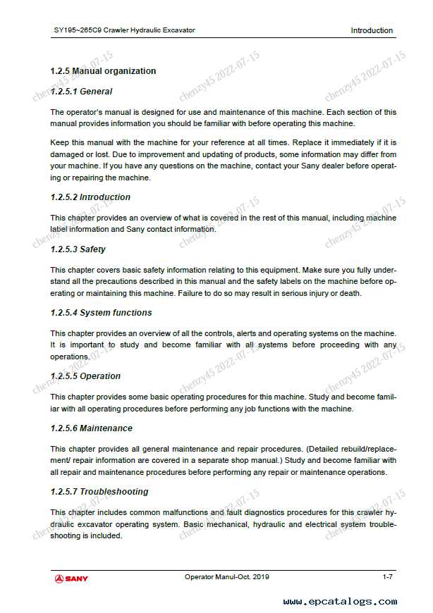 [2019]This PDF Safety, Operation & Maintenance Manual was created especially for the Sany Crawler Hydraulic Excavator SY195C9, SY205C9, SY215C9, SY225C9, SY245C9, and SY265C9 models.