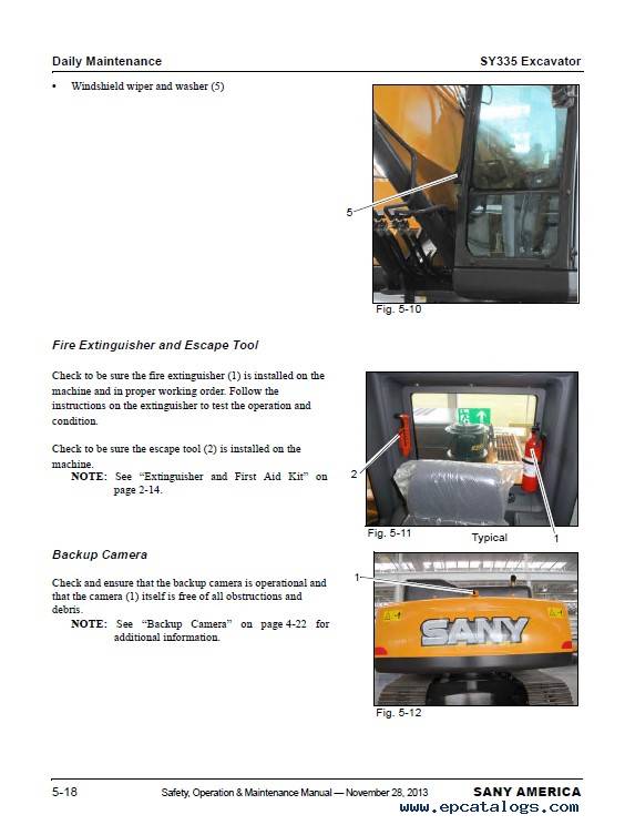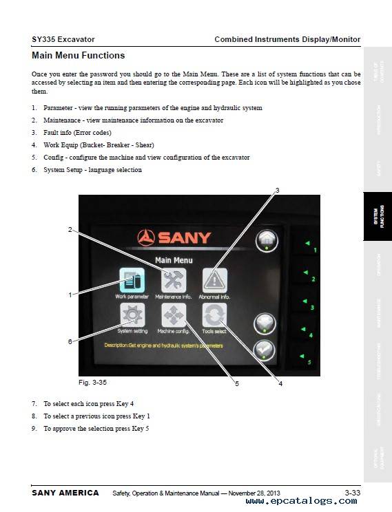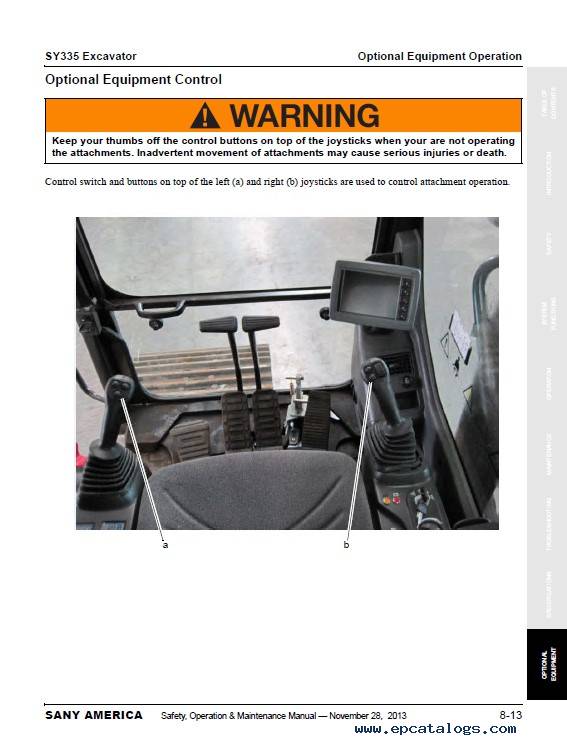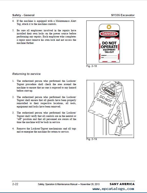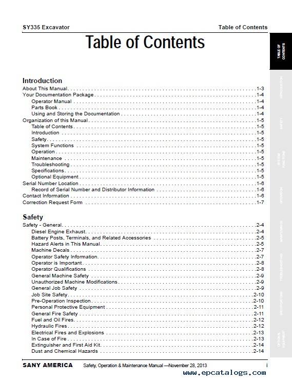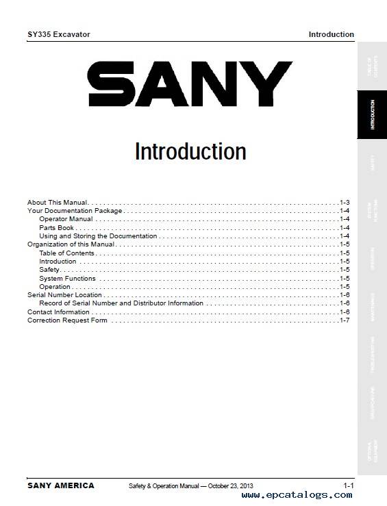 [11/2013]This PDF Safety, Operation & Maintenance Manual provides safety and operation information for the Sany Excavator SY335 Model. The manual is a system of care in the service and repair of Sany Excavators, which allows us to identify and solve problems and inaccuracies.