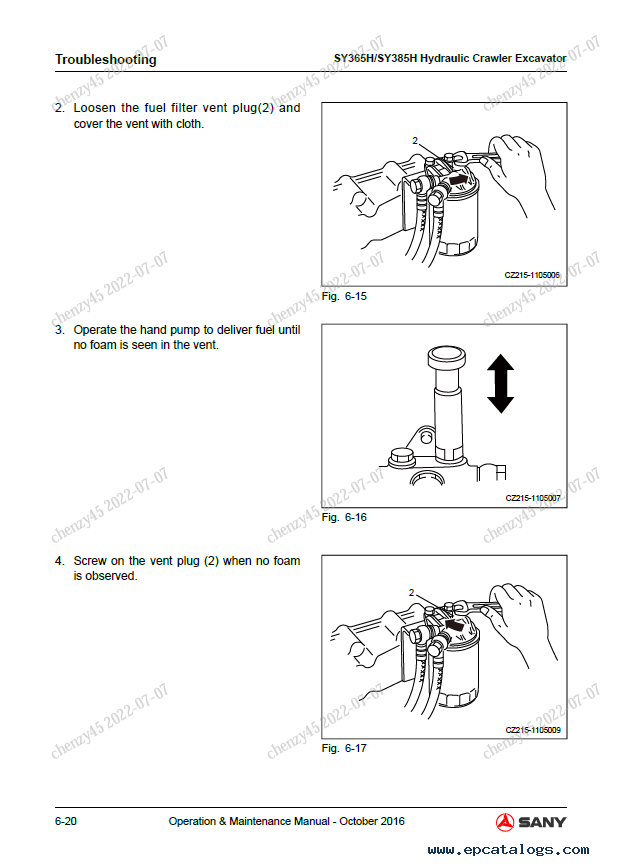 [2016]The Operation and Maintenance manual is a source of the necessary step-by-step information that will help you know more about your Sany Hydraulic Crawler Excavator SY365H, SY385H, and how to prevent future problems from happening. This PDF electronic guide is your assistant in operation and maintenance for the Sany Hydraulic Crawler Excavator SY365H, SY385H Models.