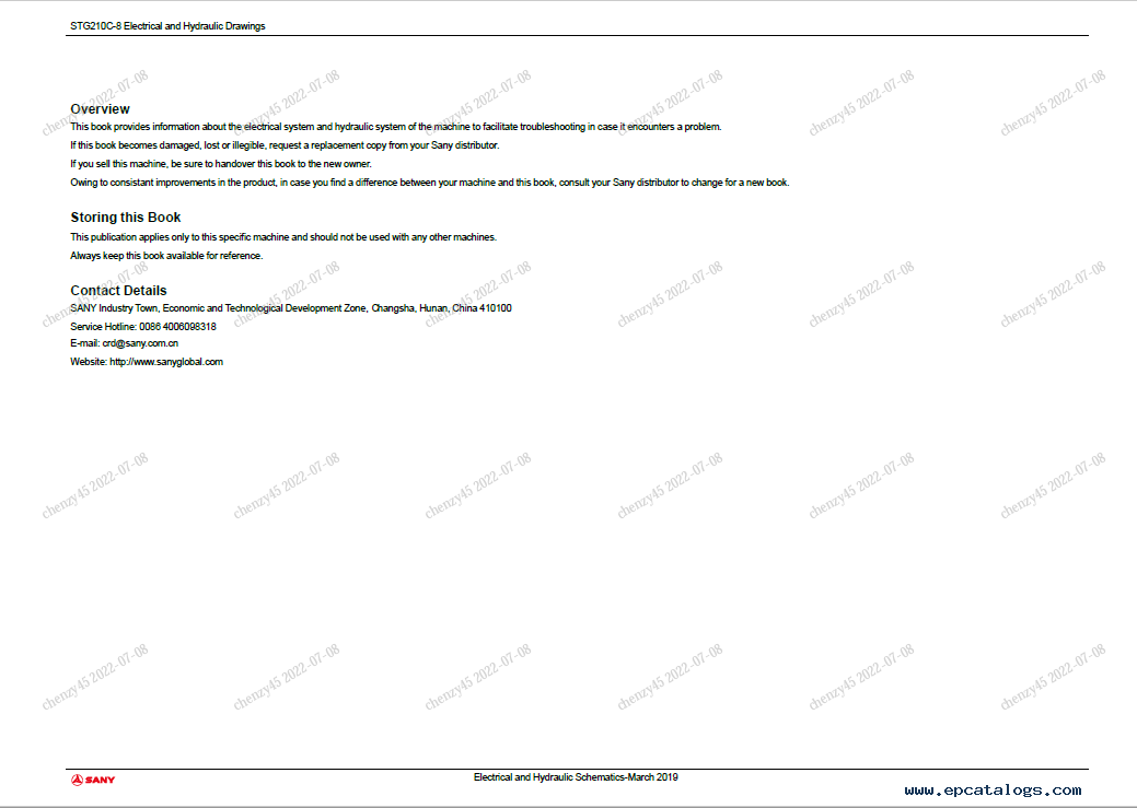 [2019]This Electrical and Hydraulic Schematics contains Electrical and Hydraulic Schematics, detailed electrical wiring and hydraulic schematics, and notes for the Sany Motor Grader STG210-8 Models.