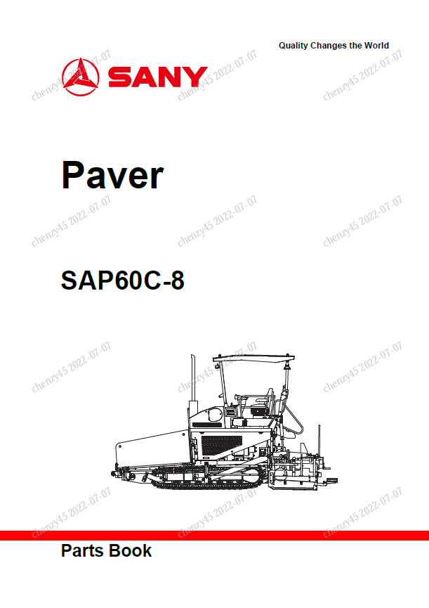 []This Electronic Parts Manual includes information about service parts, troubleshooting with diagrams and schemes, descriptions, and a list of parts material for the Sany Paver SAP60C-8 Model.
