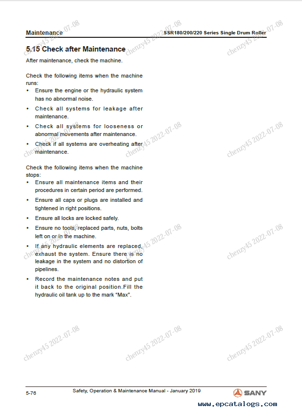 Sany Single Drum Roller SSR180C-8 Safety Operation and Maintenance Manual PDF