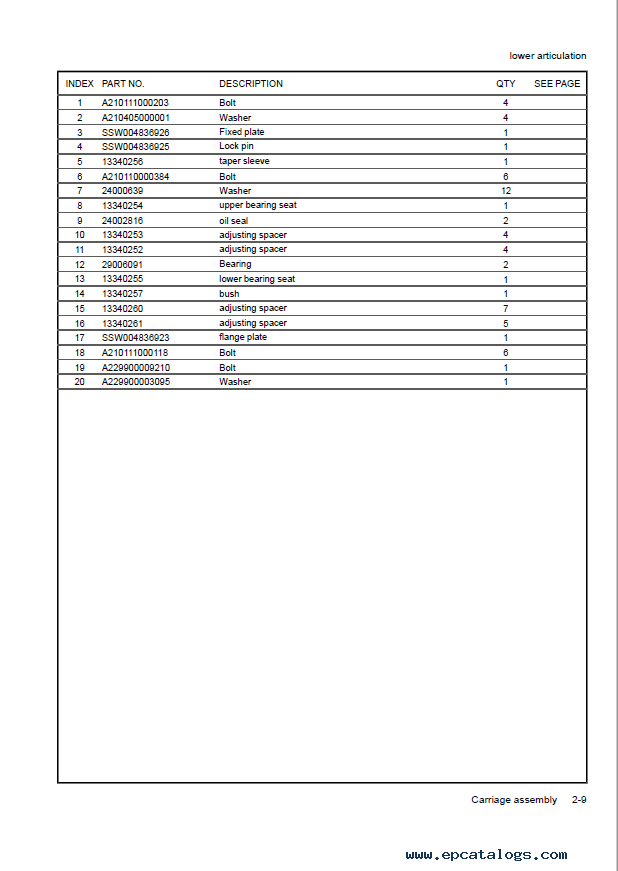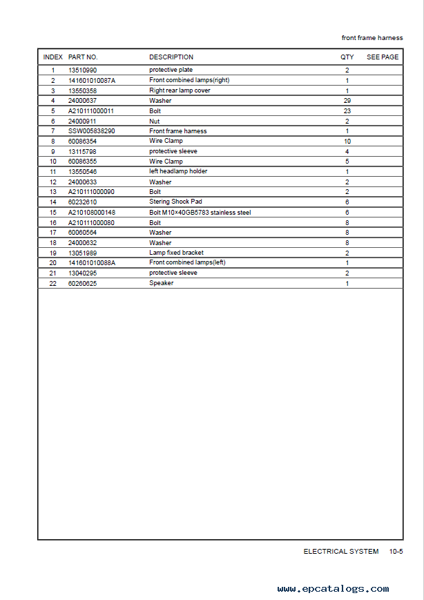 The parts manual includes information on the necessary recommended search and replacement parts, accessories, electrical system, hydraulic system, settings, a list of parts, and parts instructions, etc. In catalog, you find technical information, many pictures with the description, step-by-step recommendations, series number/name of parts, and many other details (see the detailed contents).
