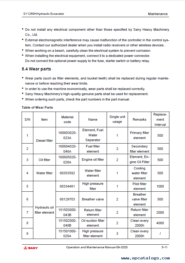 [2020]The Operation and Maintenance Manual was developed for maintenance, service instructions, correct use, step-by-step repair, and troubleshooting information, especially for the Sany Wheeled Hydraulic Excavator SY1250H model.