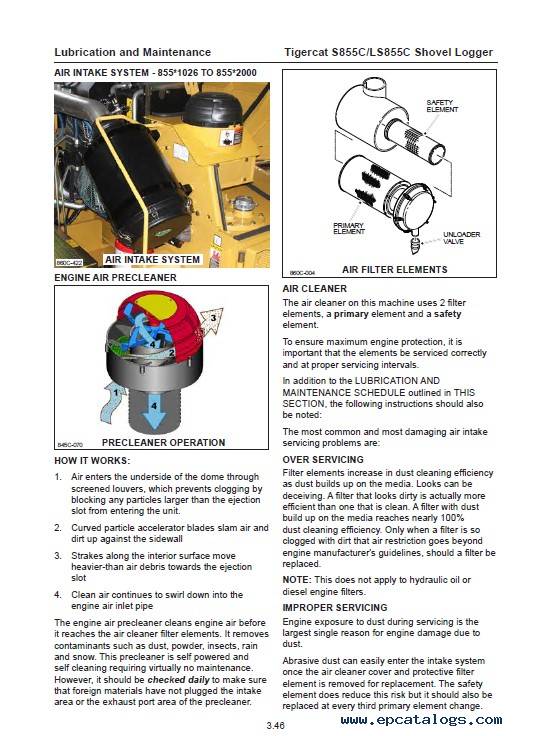 This PDF Operator's Manual covers detailed technical service information, maintenance care, and safety rules, lots of illustrations, and technical specifications for the Tigercat Shovel Loggers S855C, and LS855C Models. This manual will help you with service practice, safety procedures, and general techniques associated with the maintenance of the Tigercat Shovel Loggers.
