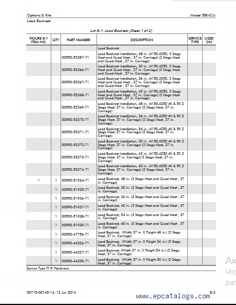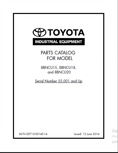 [2014]This Parts Catalog contains complete parts information, step by step instructions, and different helpful illustrations, many diagrams for the Toyota Industrial Equipment 8BNCU15, 8BNCU18, 8BNCU20 models. Electronic guide includes material about spare parts material, hydraulic components, electrical system, detailed description, transmission, a parts list, notes, safety, accessories, tables, many pictures, tables and schemes.