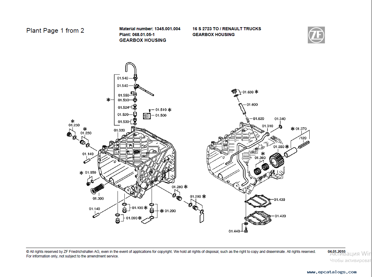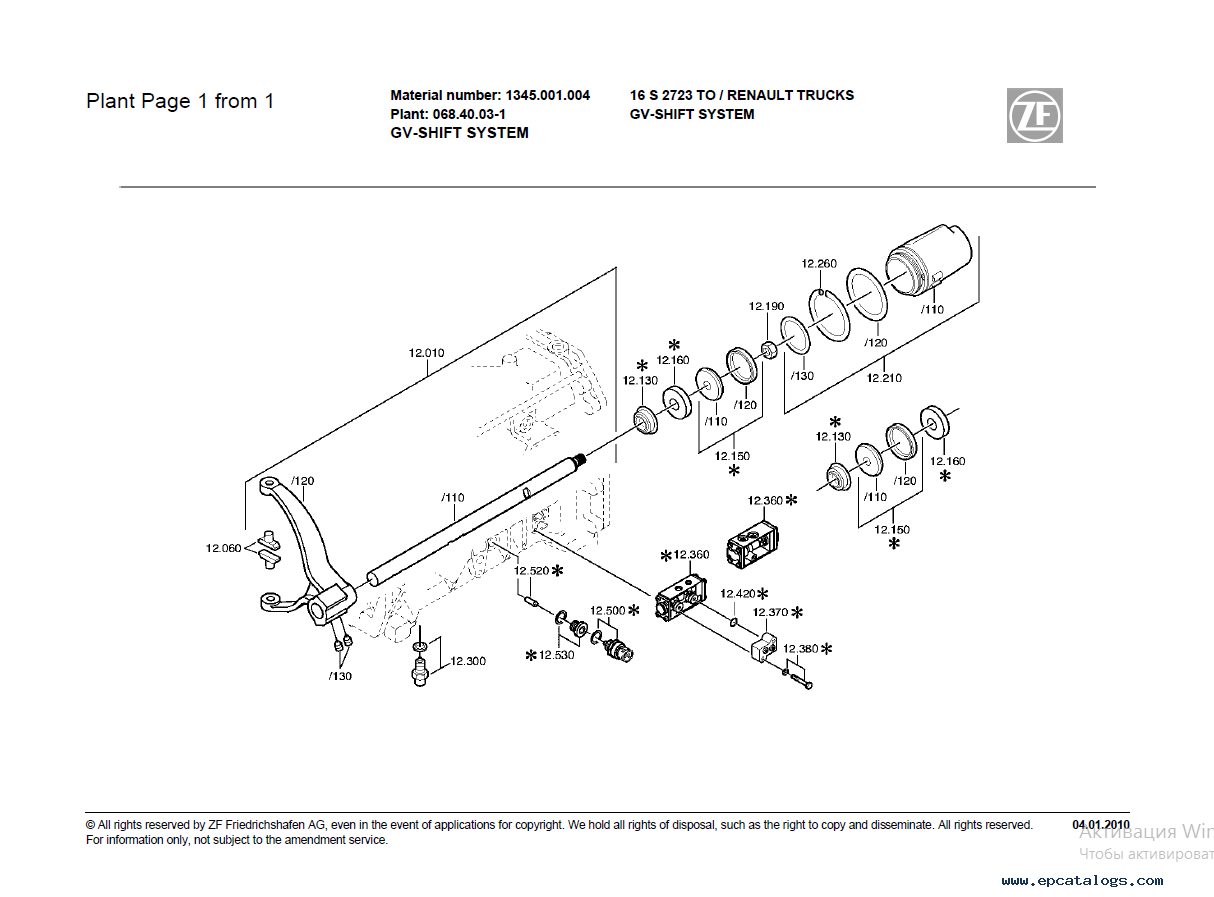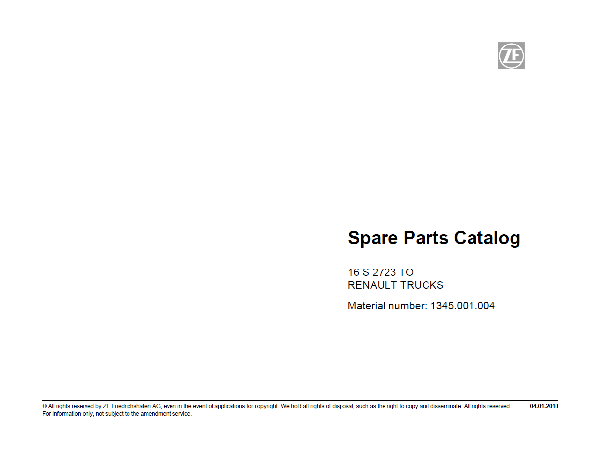 [2010]To your attention, we want to present this Spare Parts Catalog for ZF Renault Truck 16S 2723. The electronic guide includes information on how to use, maintain, troubleshooting with pictures, tables, and diagrams, assembly, parts list, and more. Spare Parts Catalog will help with the choice necessary details and help determine which parts can still work, and which are already time to replace. What is not a little important, this manual was developed for people who did not have experience in using this ZF Renault Truck 16S 2723 Series.